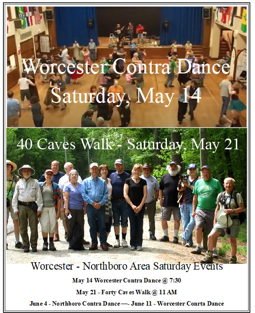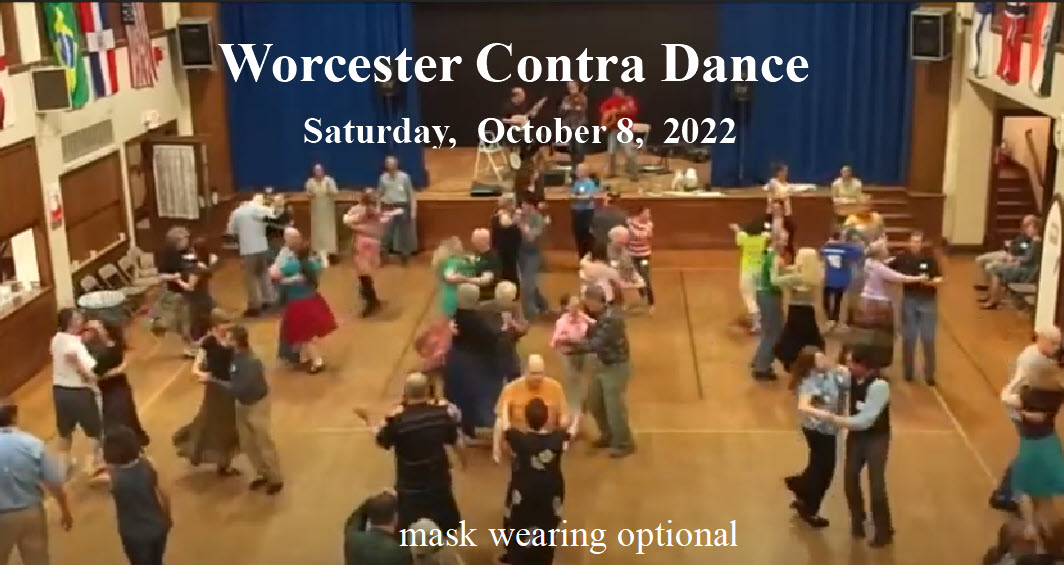 Worcester Contra Dances, second Saturdays, from 7:30–10:30 PM in the gym at Wesley United Methodist Church, located at 114 Main St. in Worcester, MA. Northboro Contra Dances are held at the First Parish UU, 40 Church Street, Northboro, MA. https://www.worcesterdance.org/